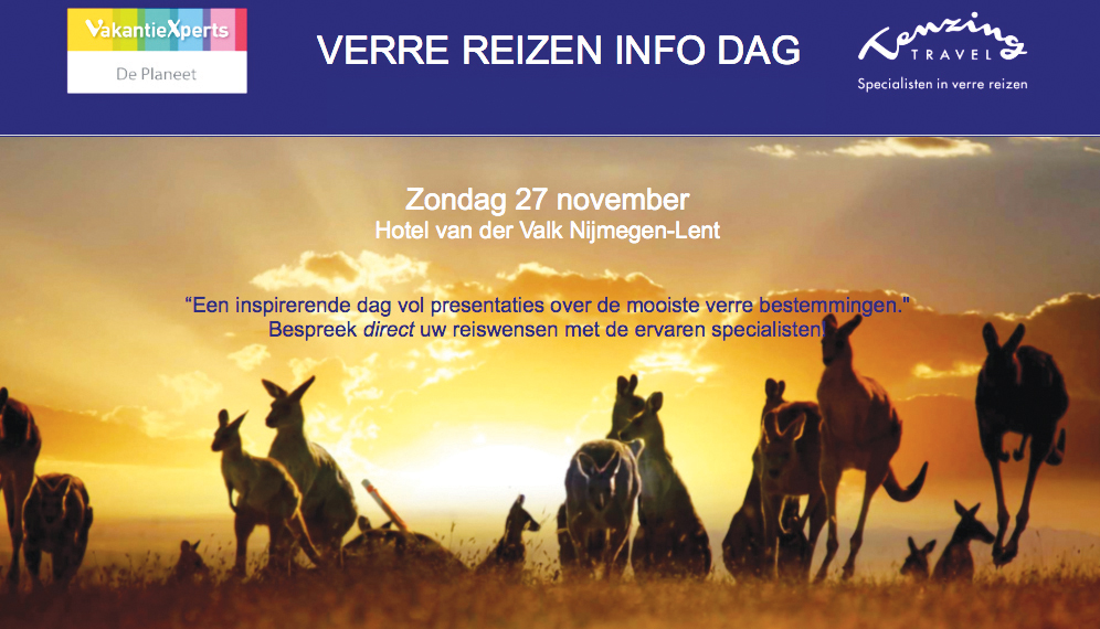 zondag 27 november in samenwerking met verre-reizenspecialist Ten Zing Travel een ‘Verre Reizen Dag’. Tijdens deze dag worden meer dan 20 inspirerende en informatieve presentaties gegeven over populaire en verrassende verre bestemmingen. Zo komen onder andere de Verenigde Staten, Argentinië, Cuba, Japan, Sri Lanka, Australië en Zuid-Afrika aan bod. Ook zal er aandacht zijn voor cruises en kunnen de bezoekers een kijkje nemen in een camper.