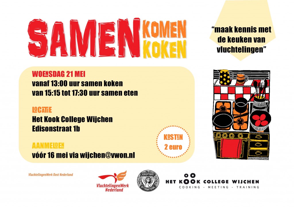 Na de eerste succesvol verlopen kookbijeenkomst, waarin vier Syrische koks heerlijke gerechten gemaakt hebben, organiseert vluchtelingenwerk op 21 mei een tweede kook, eet- en ontmoetingsbijeenkomst. De bijeenkomsten worden mogelijk gemaakt door subsidie van de soroptimistclub Batenburg “Maas en Waal” en doordat het kookcollege haar keuken beschikbaar stelt. Op de bijeenkomst van 21 mei staat de Somalische keuken centraal.