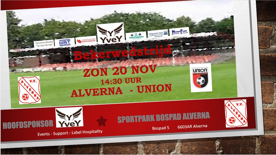 Zondag 20 november vindt aan het Bospad 5 in Alverna de bekerwedstrijd plaats tussen vv Alverna 1 en Union 1, aanvang 14.30 uur. Komt u de Wijchense ploeg aanmoedigen?