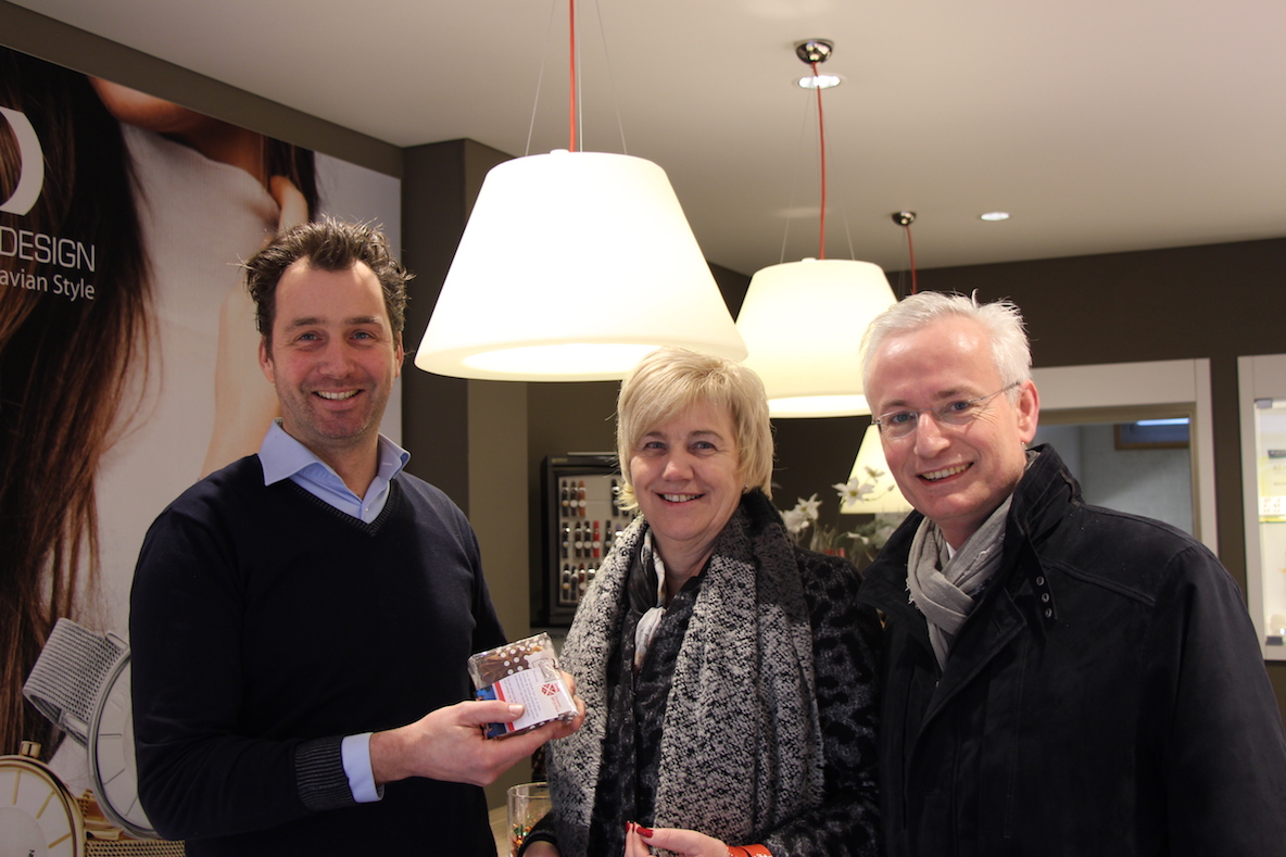 Op de foto: winkelier Pascal Mollen van Jewels & Trends neemt de felicitaties in ontvangst van wethouder Schaap en burgemeester Verheijen.