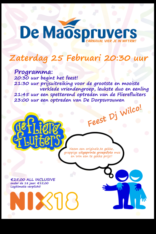 Zaterdag 25 februari, 20.30 uur: Vriendenbal met een optreden van de Flierefluiters.