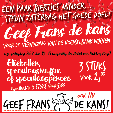 Op carnavalszaterdag 25 februari gaan de "Wijchense Kerstengelen" in de Touwslagersbaan voor de winkel van Bakker Bart heerlijke oliebollen, speculaas muffins en speculaaspencees verkopen tegen weggeefprijzen. De opbrengst komt volledig ter beschikking van de Voedselbank, mede om de verbouw- en verhuiskosten te betalen. De Wijchense Mariakapel en de actie Geef Frans met een Kerstpakket de Kans zullen de opbrengst zelfs verdubbelen. Met speciale dank aan Bakker Bart Wijchen voor het gratis beschikbaar stellen van de versnaperingen.