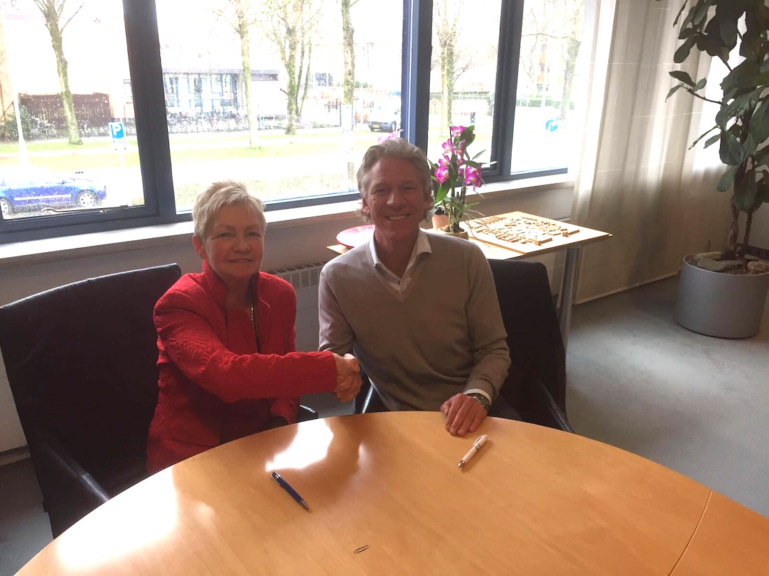 Op de foto: Trudy Kersten (eigenaresse AMC Groep) en William Vlemmix (directievoorzitter ICS Groep) schudden elkaar de hand na afronding van de overname.