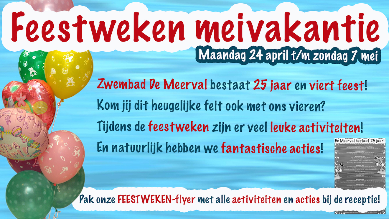 Zwembad de Meerval bestaat dit jaar 25 jaar en dat willen zij graag met u vieren. Daarom zullen in de meivakantie van 24 april tot en met 7 mei voor jong en oud tal van activiteiten georganiseerd worden. Er zullen o.a. spelletjesmiddagen georganiseerd worden en een speciale peuterdisco-dansmiddag.