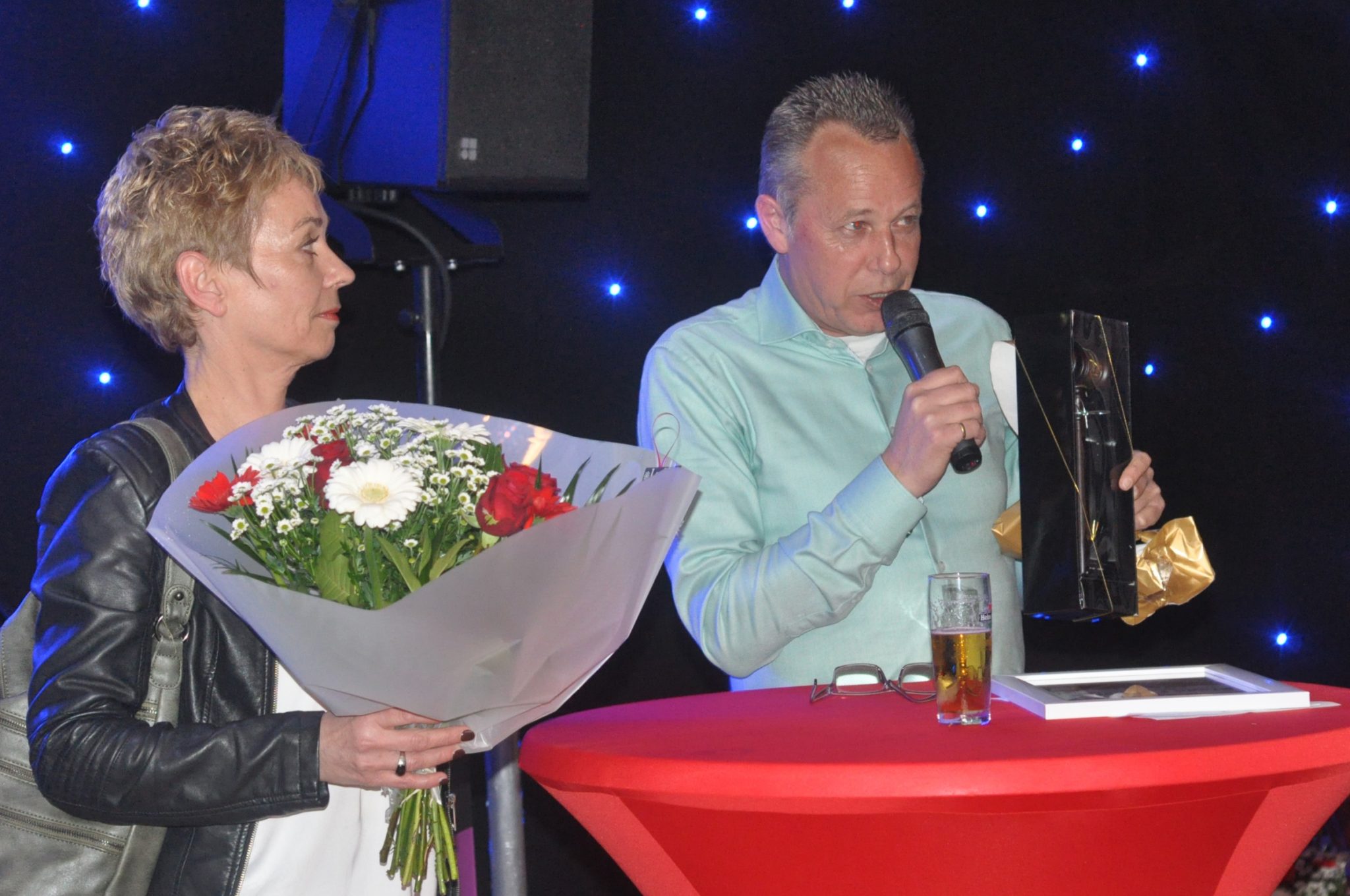 De geboren Drent was stomverbaasd en onderging samen met zijn vrouw de huldiging door bestuurslid Arno Jansen die een vergulde voorzittershamer voor hem had en een mooie bos bloemen voor zijn vrouw.