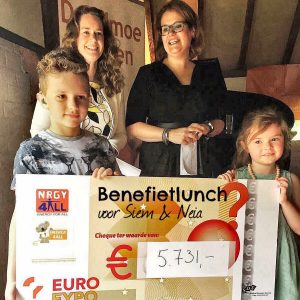 Tijdens de Benefietlunch zijn aansprekende producten en arrangementen geveild. De 40 veilingitems zijn door sponsoren, vooral uit de gemeenten Wijchen en Mill en Sint Hubert, belangeloos beschikbaar gesteld. De totale opbrengst, te weten: € 5.731,-, gaat volledig naar het onderzoek voor de ontwikkeling van een medicijn. De cheque is door veilingmeester Ad Heijs ter plekke uitgereikt aan Marieke van Leent en Bianca Derks, de moeders van Siem en Neia. Zij toonden hun enthousiasme en spraken hun dankbaarheid uit aan de vele betrokkenen die deze actie tot een succes hebben gemaakt. Op bijgaande foto ziet u Siem en Neia met de check.