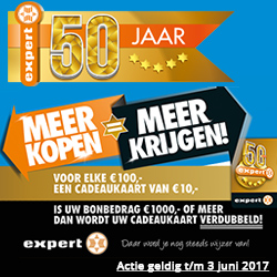 Deze twee weken ontvangt u vanwege het 50-jarig jubileum van Expert bij een aankoop een 'Expert 50 jaar-cadeaukaart'. Voor elke 100,- stort Expert 10,- op uw Expert 50 jaar-cadeaukaart. Koopt u voor een totaalbedrag van 1.000,- of meer, dan wordt de waarde op de Expert 50 jaar-cadeaukaart verdubbeld.