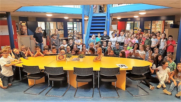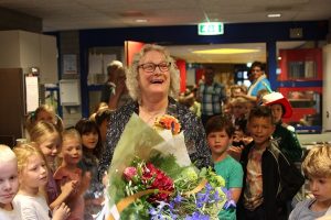 Op vrijdagmorgen was de huldiging en de leerlingen waren er helemaal klaar voor. Samen vormden ze een lange haag waardoor Hannie naar de hal van de school kwam lopen waar ze onder luid applaus werd verwelkomt!