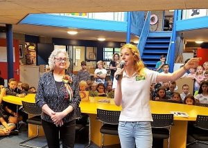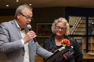 Namens D66 verwelkomde Emmy Wittenberg natuurlijk Hannie, de leerlingen, leerkrachten en aanwezige ouders en legde in het kort het belang van betrokken conciërges in het onderwijs toe. Vervolgens gaf zij het woord aan Conrad Sommerdijk die als juryvoorzitter Hannie feliciteerde en haar de Oorkonde overhandigde. “Als pleister plakkende surrogaatmoeder, zo sta jij bekend bij alle 850 kinderen van de Trinoom. Geen wonder dat de kinderen jou de ‘Baas van de School’ noemen.” zo sprak Conrad de winnares toe.