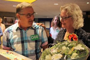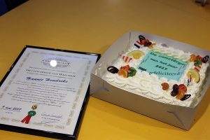 Na de lovende woorden en felicitaties van vorig winnaar Mike Merkus, taart van D66 en een luidkeels ‘Lang zal ze leven’ van de leerlingen bedankte een dankbare Hannie alle aanwezigen en vond ze dat het tijd was voor koffie. Die verzorgde ze vanzelfsprekend zelf, als toegewijde conciërge.