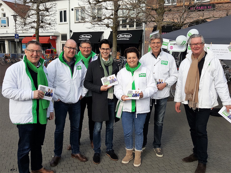 Foto: Esther met D66-collega's op de markt in Wijchen begin dit jaar.