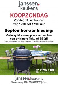 Janssen Keukens aan de Nieuweweg 193, van 12.00 tot 17.00 uur kunt u de prachtige showroom bezoeken. En Janssen Keukens heeft een superaanbieding voor u: de hele maand september ontvangt u bij aankoop van een keuken een oroginele Takumi barbecue gratis!*