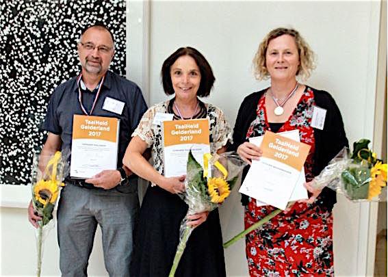 Op vrijdag 8 september zijn in Arnhem veertien genomineerde Gelderse TaalHelden in het zonnetje gezet. Ook kozen alle 50 aanwezigen gezamenlijk een afgevaardigde voor de landelijke TaalHeldenverkiezing in januari 2018 in drie categorieën: Mia Pouwels uit Wijchen (Taalbegeleider, midden op foto), Hans Kasser uit Beuningen (Taalcursist) en José Keetelaar uit Nijmegen (Bruggenbouwer). TaalHelden zijn mensen die zich bijzonder verdienstelijk inzetten voor een beter geletterd Nederland. Tijdens de bijeenkomst vertelde OHRA wat zij doen om hun diensten beter begrijpelijk te maken. Ook UWV Achterhoek deelde een goed voorbeeld: zij bereiken steeds beter autochtone laaggeletterden. De verkiezing vond plaats in de Week van de Alfabetisering (4 t/m 10 september) tijdens een bijeenkomst bij OHRA, in samenwerking met UWV Achterhoek en Stichting Lezen & Schrijven.