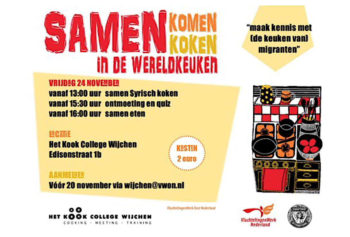 De Wereldkeuken meldt: "Op vrijdag 24 november maken we Syrische gerechten. Deze gerechten maken we samen met drie Syrische koks en enkele Nederlanders uit Wijchen. Dit keer staat er vis op het menu. Het belooft een gezellige bijeenkomst te worden. U kunt zich opgeven voor samen koken en eten of alleen maar voor samen eten."