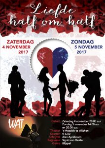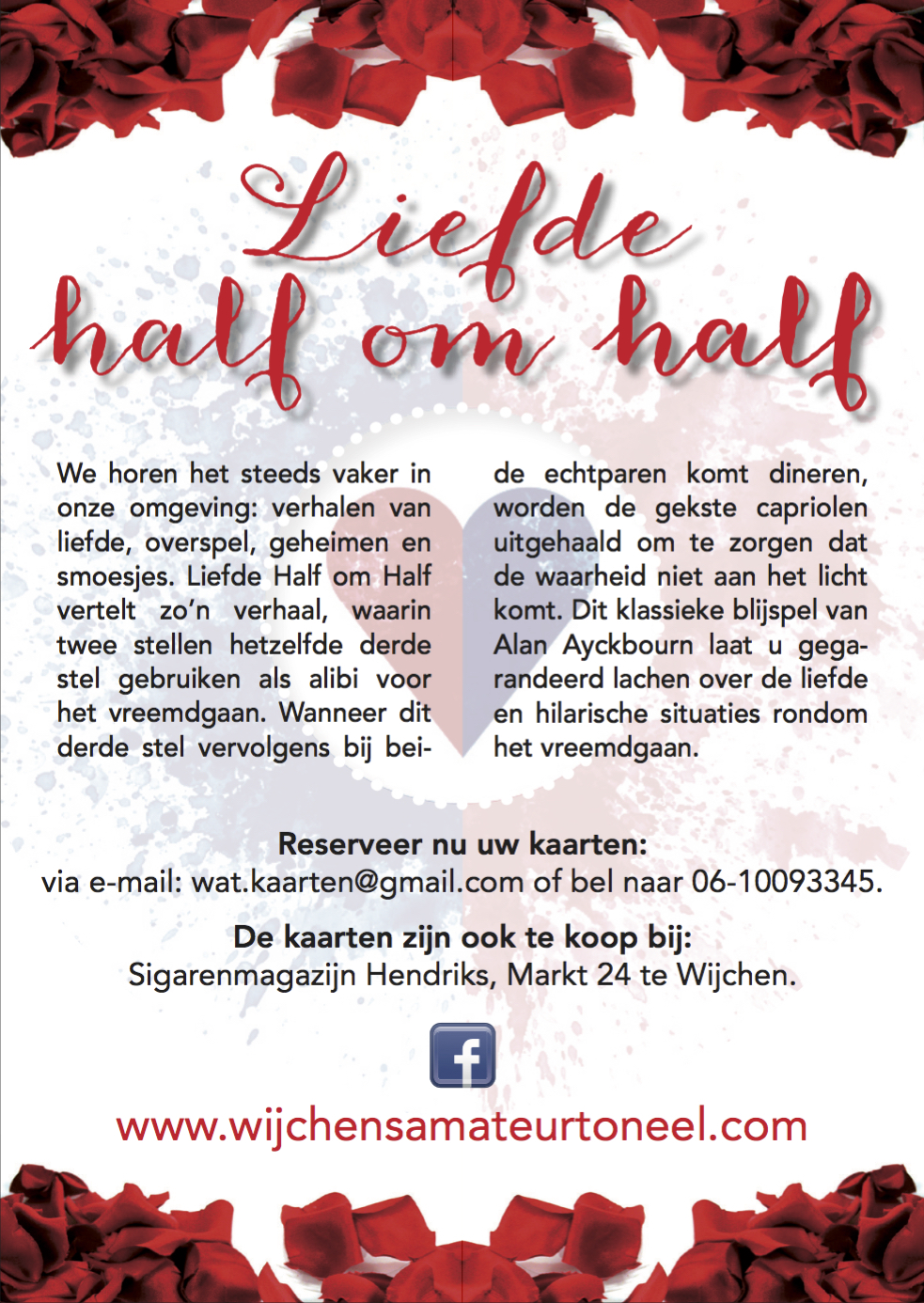 We horen het steeds vaker in onze omgeving. Verhalen van liefde overspel, geheimen en smoesjes. Liefde Half om Half vertelt zo’n verhaal, waarin twee stellen hetzelfde derde stel gebruiken als alibi voor het vreemdgaan. Wanneer dit derde stel vervolgens bij beide echtparen komt dineren worden de gekste capriolen uitgehaald om te zorgen dat de waarheid niet aan het licht komt. Dit klassieke blijspel van Alan Ayckbourn laat u gegarandeerd lachen over de liefde en hilarische situaties rondom vreemdgaan.