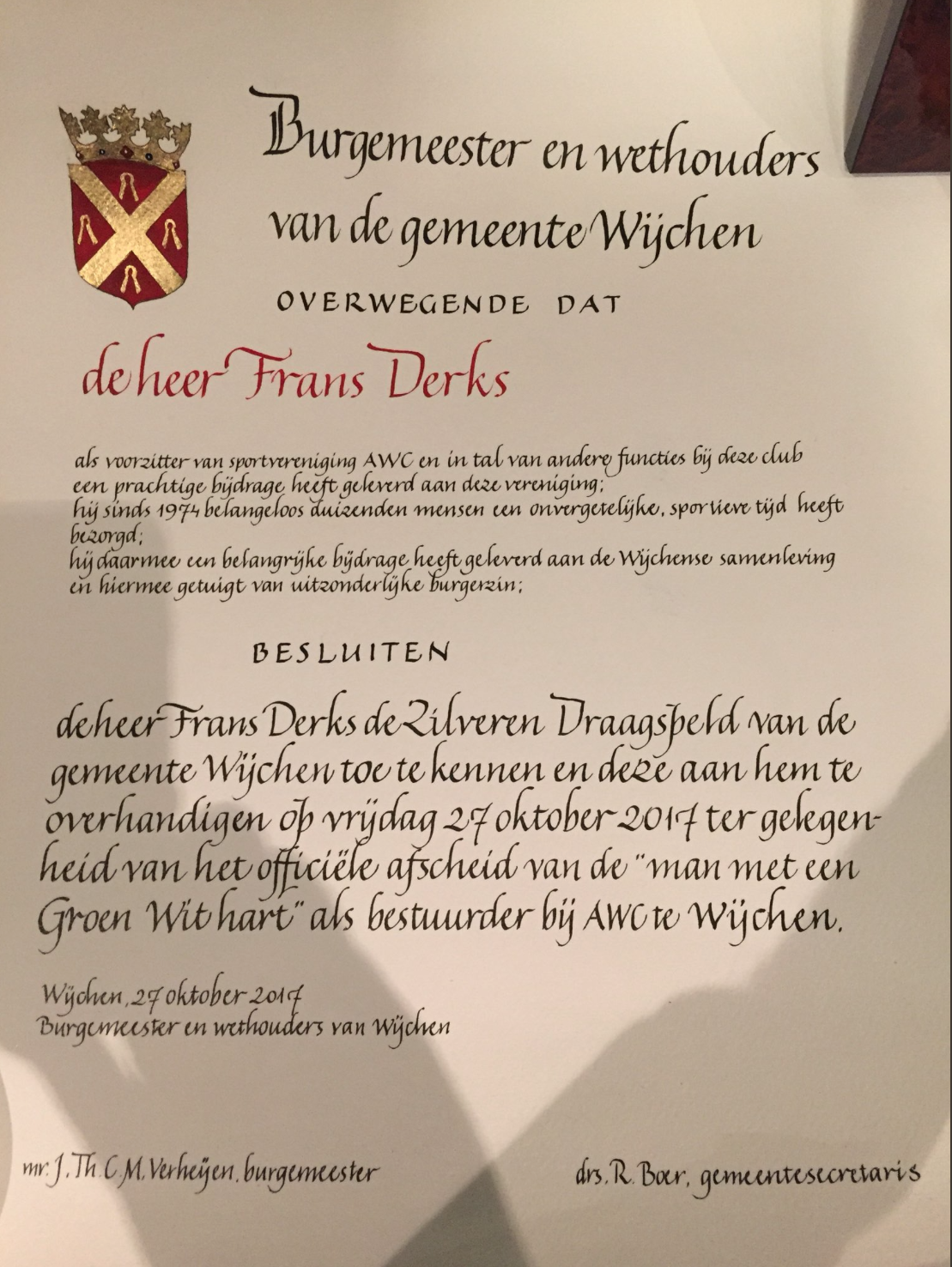 Burgemeester Hans Verheijen heeft op vrijdagavond 27 oktober de Zilveren Draagspeld van de gemeente Wijchen uitgereikt aan Frans Derks, die na 50 jaar trouwe dienst bij voetbalclub AWC besloot om zijn activiteiten bij de club neer te leggen. De burgemeester: "Man van de buitencategorie!"