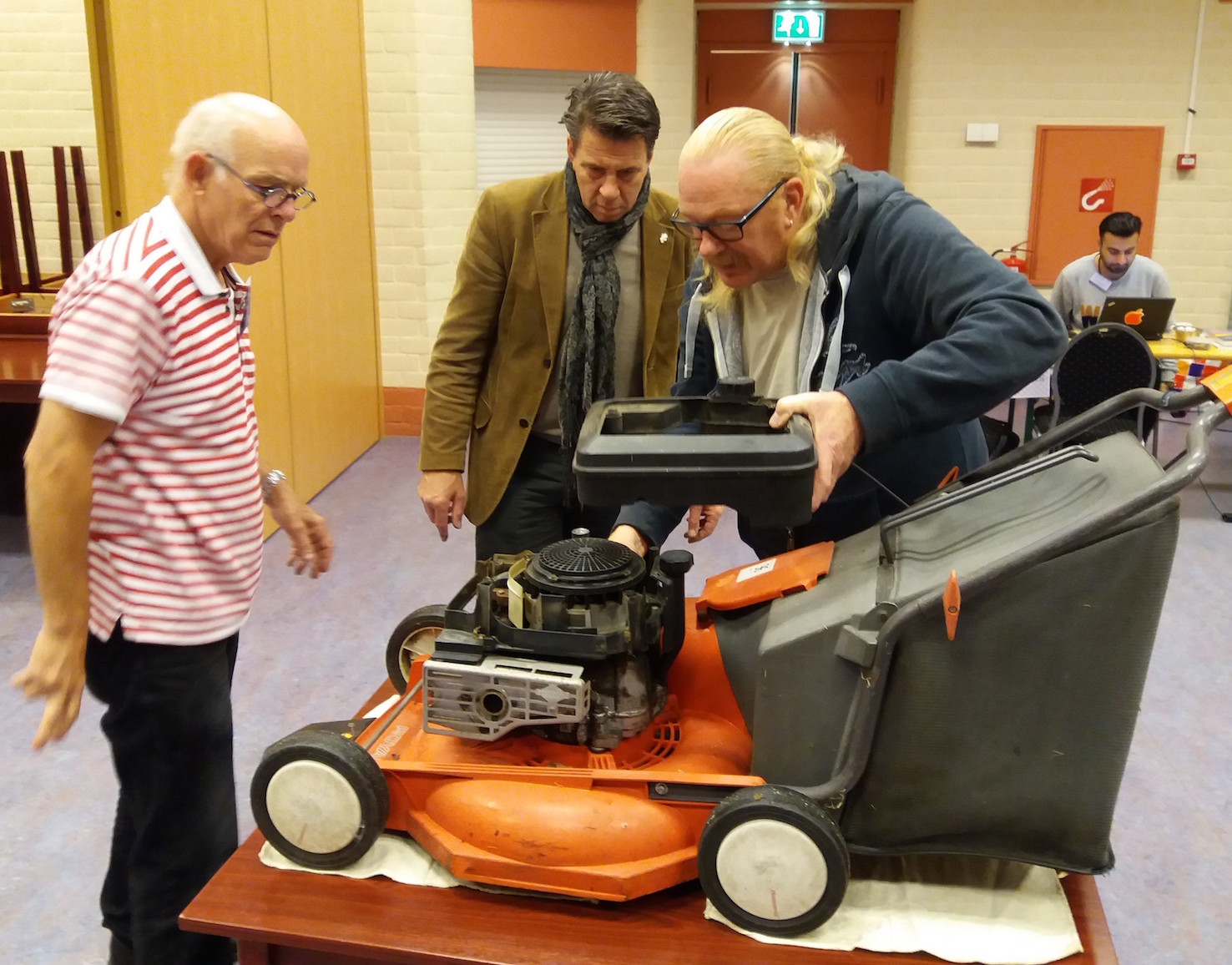 Zaterdag 21 oktober kwam rond 11.00 uur een BW'er, Bekende Wijchenaar, het RepairCaféWijchen binnenlopen met een grasmaaier met een benzinemotor. Het trekkoord om het apparaat te starten was afgebroken en aanduwen lukt niet, zei de eigenaar. Of de handige heren van het RepairCaféWijchen er even naar wilden kijken en of ze dat euvel zouden willen herstellen. Het was de eerste keer dat een dergelijk apparaat werd binnengebracht, dus vol enthousiasme stortten twee heren van het werkstation apparaten plus een aspirant vrijwilliger, die deze dag even kwam kijken, zich op deze klus.
