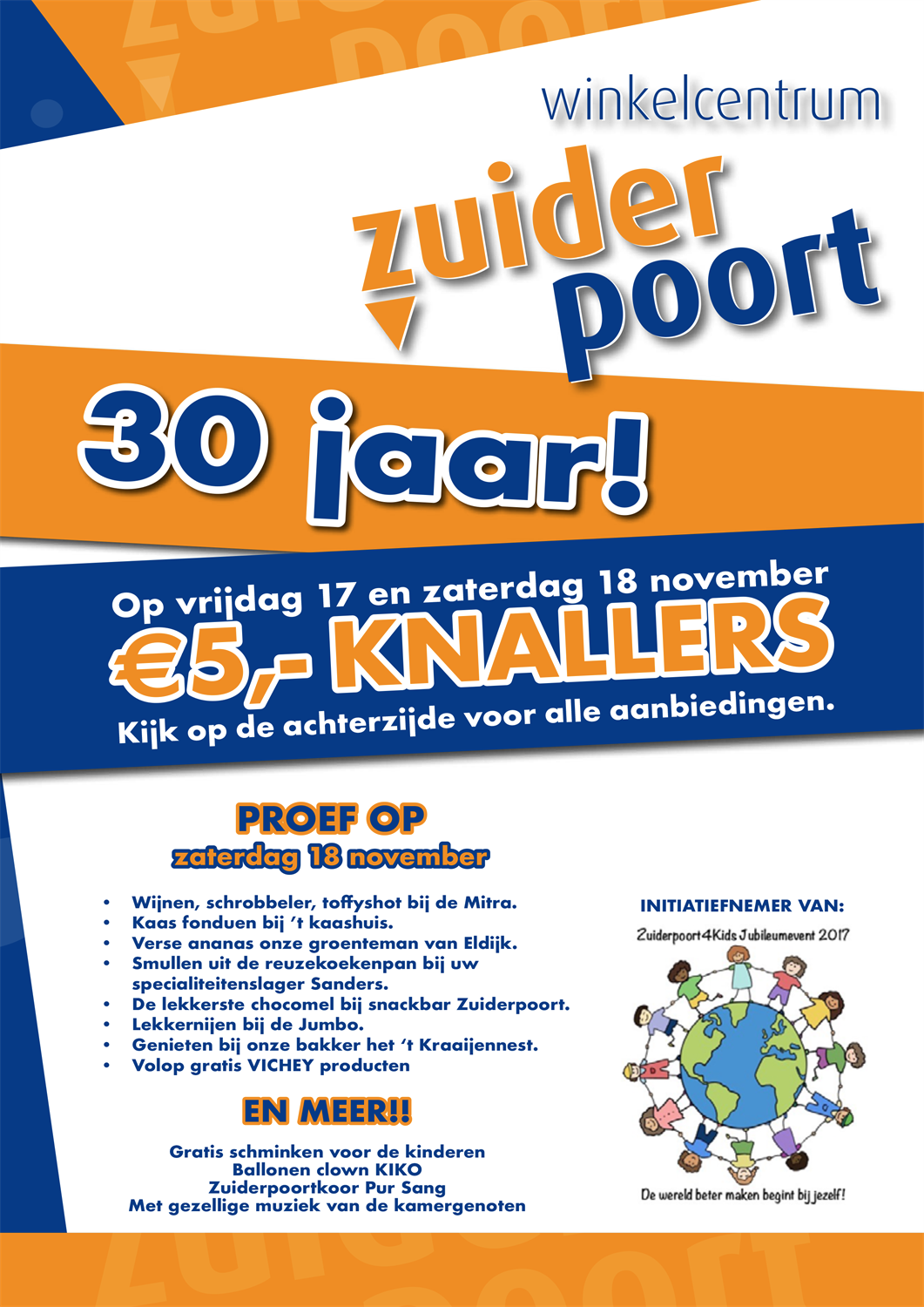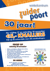 Mede dankzij de sponsoring van Theater ’t Mozaïek, de Rabobank en de Gemeente Wijchen, wordt het dus een mooi feest voor Winkelcentrum Zuiderpoort en de buurtkinderen in de week van 13 november! Een keer iets anders dan alleen maar acties voor de consumenten. Alhoewel die er op 17 en 18 november ook zullen zijn. Want Zuiderpoort pakt groots uit op zijn verjaardag en iedereen wordt getrakteerd!