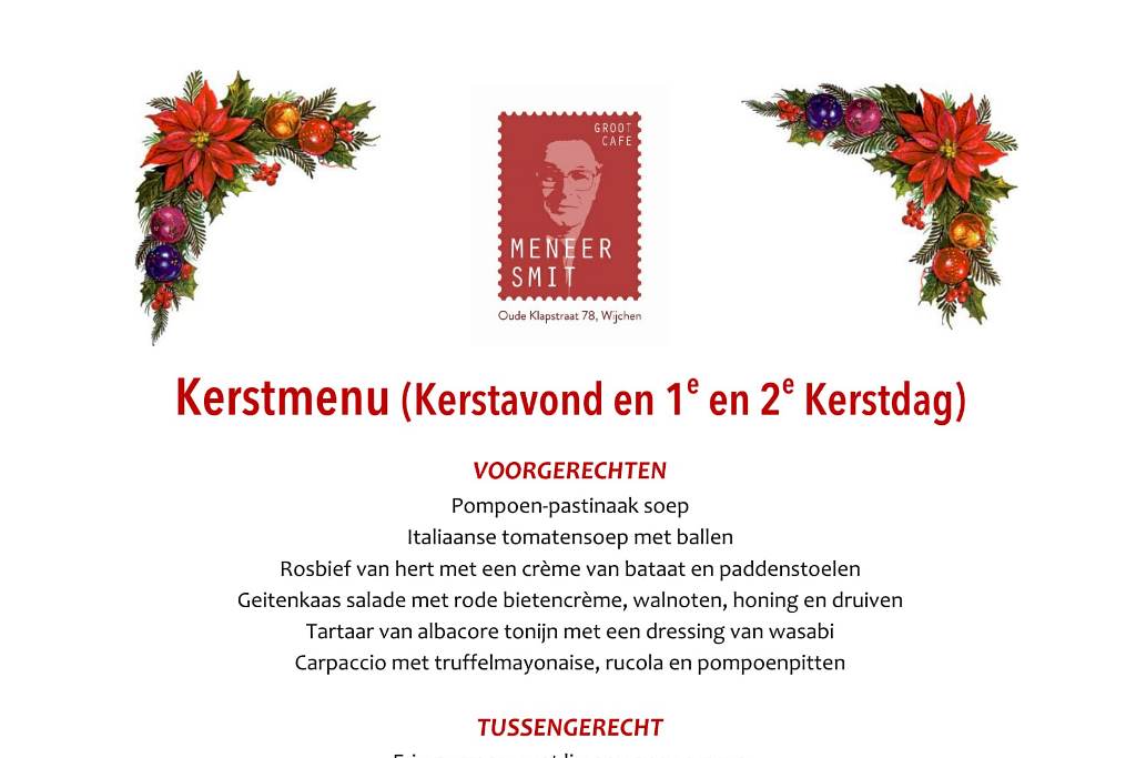Tijdens de Kerstdagen is Meneer Smit alle dagen geopend! Op Kerstavond, Eerste én Tweede Kerstdag serveren ...