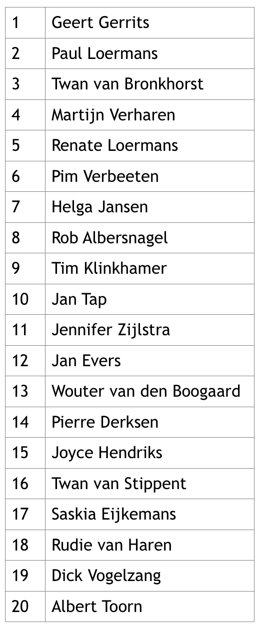Maandagavond 30 oktober werd Geert Gerrits unaniem gekozen tot de nieuwe lijsttrekker van Kernachtig Wijchen. En tijdens de Algemene Ledenvergadering van maandag 20 november heeft de ALV ingestemd met de hierna volgende kieslijst: