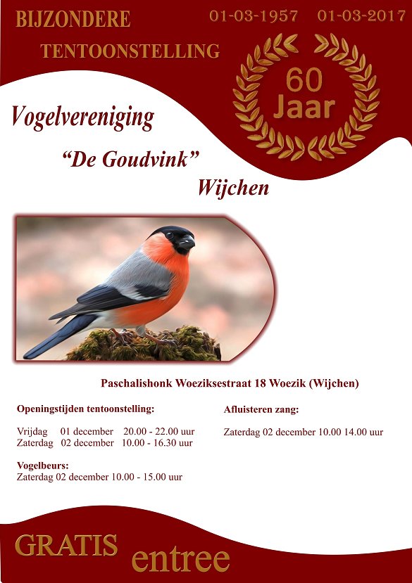 Vogelvereniging “De Goudvink” te Wijchen organiseert ook dit jaar weer een bijzondere tentoonstelling. Het wordt alweer de 60ste tentoonstelling van