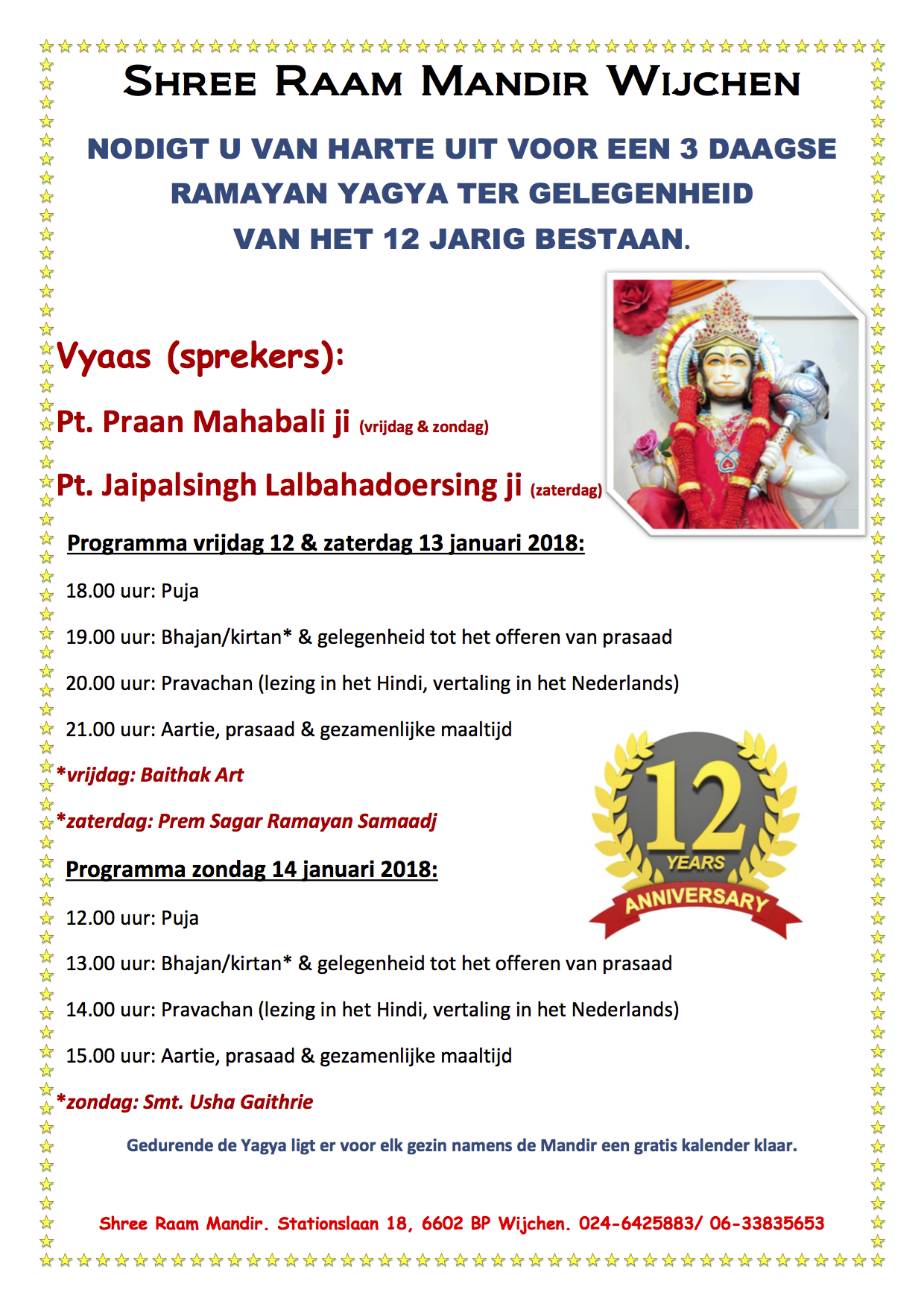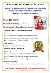 Hindoestaans Cultureel centrum Shree Raam Mandir Wijchen wenst u het allerbeste voor het nieuwe jaar en nodigt u van harte uit voor een 3-daagse Ramayan Yagya op 12, 13 & 14 januari 2018. Deze Yagya wordt gehouden t.g.v. het 12-jarig bestaan van de Mandir.