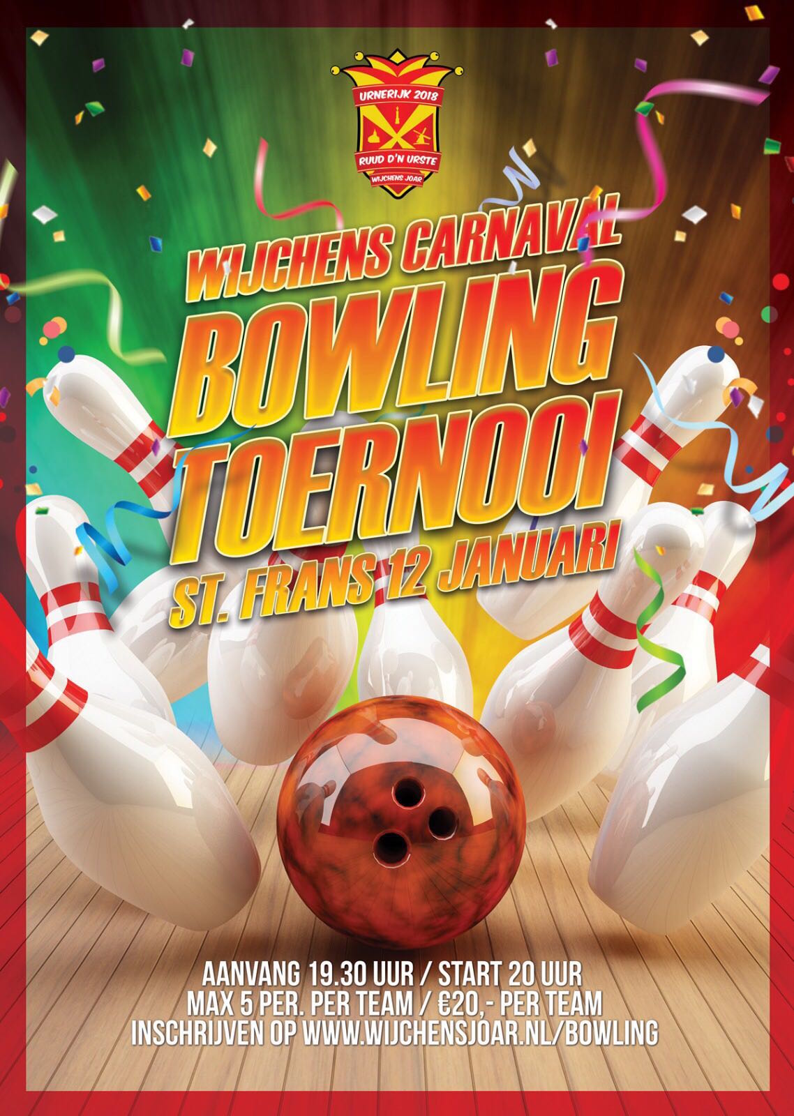 Er zijn nog enkele banen vrij bij het jaarlijkse carnavalsbowlingtoernooi van 12 januari bij St. Frans aan de Heumenseweg 192. Naast het bowlen is er uiteraard veel ruimte voor gezelligheid met feest-dj Twannie. Meld je nu aan op www.Wijchensjoar.nl/bowling.