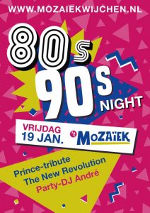 Vrijdag 19 januari gaat iedereen los tijdens de swingende 80’s/90’s-night in Theater ’t Mozaïek. En welke artiest wist in beide decennia wereldhits te scoren waarop iedereen stond te dansen? Prince natuurlijk! DJ André zorgt in de Huiskamer dat o.a. ook Michael Jackson, Madonna, The Backstreet Boys en The Spice Girls voorbij komen. Dat wordt heel hard meezingen en voetjes van de vloer in zowel de theaterzaal als de Huiskamer! Tickets zijn nog te boeken via