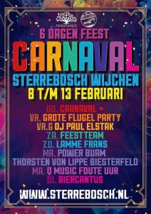 16:00 uur: Na de optocht komt de polonaise op gang in de grote zaal met de prijsuitreiking van de optocht. In het Wijchens Joar mag op het podium natuurlijk Leon Klaus niet ontbreken en in de tent komen de Flierefluiters de boel op z’n kop zetten.