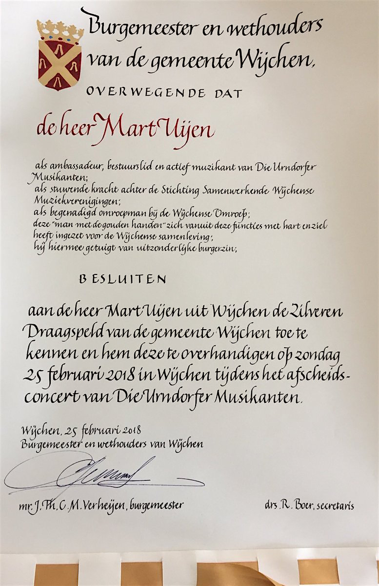 Mart kreeg de Speld met oorkonde voor mede zijn werk voor de Wijchense Omroep en de Samenwerkende Muziekverenigingen! (klik op oorkonde voor groot)