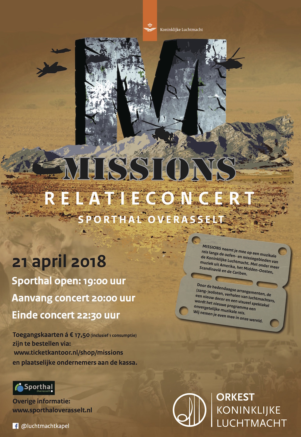 Droom je ook weleens van “the sound of freedom”? Kom dan op zaterdag 21 april naar Sporthal Overasselt en beleef het mee! Het wereldberoemde orkest van de Koninklijke Luchtmacht treedt voor je op met “Missions”. In deze compleet nieuwe, muzikale show reis je met het orkest de hele wereld over; van Amerika naar het Midden-Oosten, van Scandinavië naar de Caraïben! 41 blazers en een 7-koppige ritmesectie zorgen, samen met zangers en zangeressen, voor een ongeëvenaard muzikaal spektakel. Soulvolle, symfonische popmuziek met een krachtige groove en een herkenbare beat. Dat alles wordt ondersteund met een prachtige lichtshow op een grote en brede ledwall.