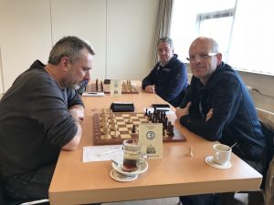 Henk Massink had een lastige schaakmiddag tegen de sterke Van Roosmalen. Massink kwam twee pionnen achter en zag zich gedwongen zijn Koning om te leggen.