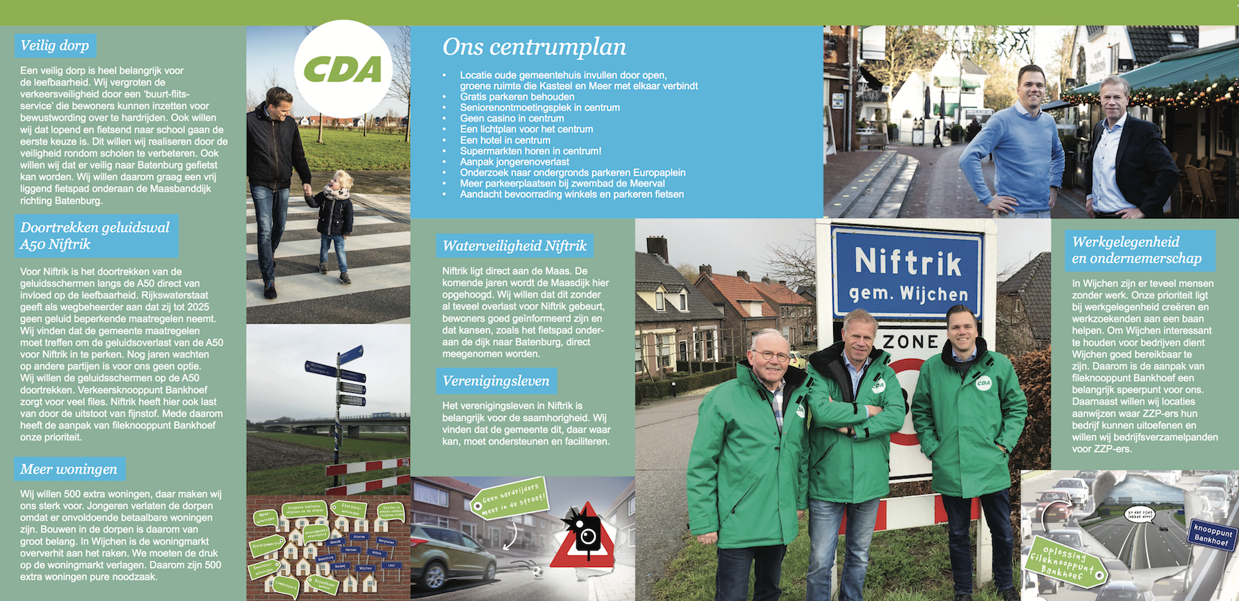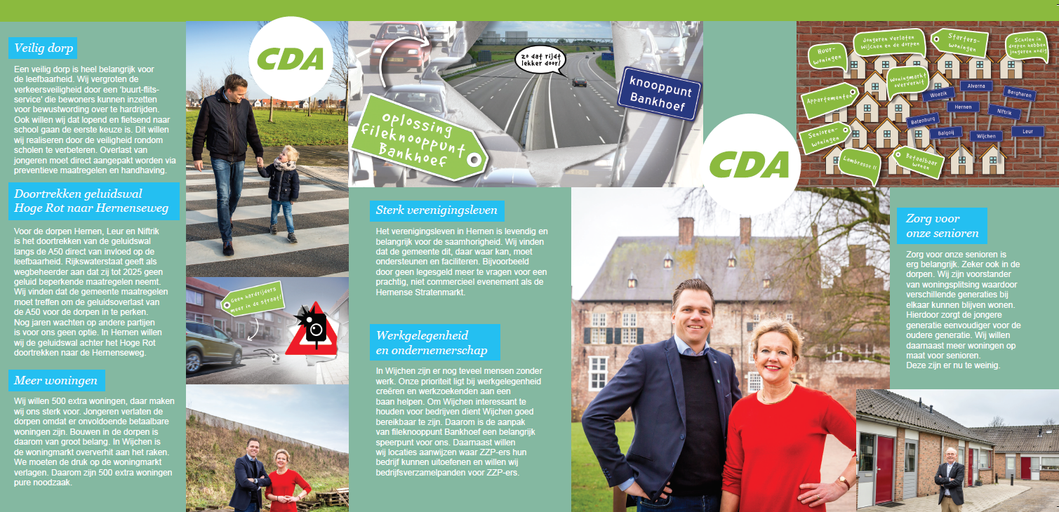 De CDA-flyers voor Niftrik en Hernen met daarin de tekst over het doortrekken van de geluidswal: