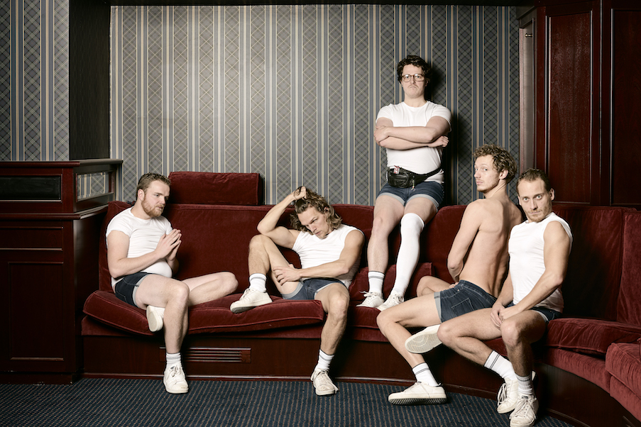 De vijf heren wonnen in 2014 de publieksprijs op het Groninger Studenten Cabaret Festival. Wie hun debuutvoorstelling ziet, begrijpt wel waarom. Dit gaat namelijk overal en vooral nergens over, gelukkig maar! Gekleed in spijkerhotpants en strakke, witte T-shirts laten deze jonge honden van het Nederlandse cabaret een tsunami van visuele grappen, gewelddadige audiocollages en hilarische ongein op het publiek los. De blonde jongens, een soort stuiterende wannabe Chippendales, worden voortdurend in de wielen gereden door hun kompaan Tim, een vadsige sukkel die tegen wil en dank als een vraatzuchtige rode draad door de voorstelling heen banjert.