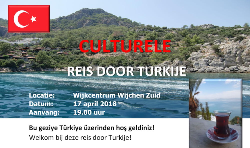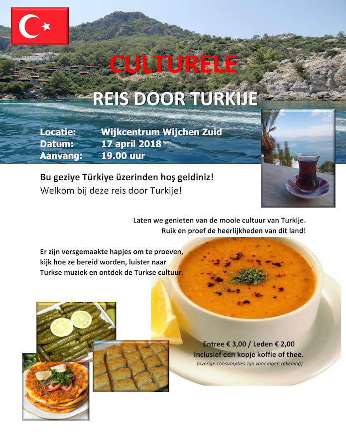 Wijkcentrum Wijchen-Zuid nodigt u uit voor een 'culturele reis door Turkije' op dinsdag 17 april, vanaf 19.00 uur. Naast allerlei informatie zijn er Turkse hapjes en muziek. Entree €3,-/leden €2,-, incl. één kopje koffie/thee.
