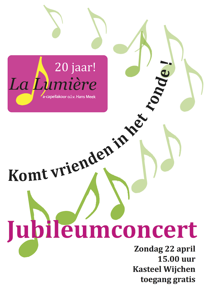 Met als titel “Komt vrienden in het ronde” geeft a-capellakoor La Lumière op zondag 22 april a.s. een jubileumconcert vanwege haar 20-jarig bestaan.