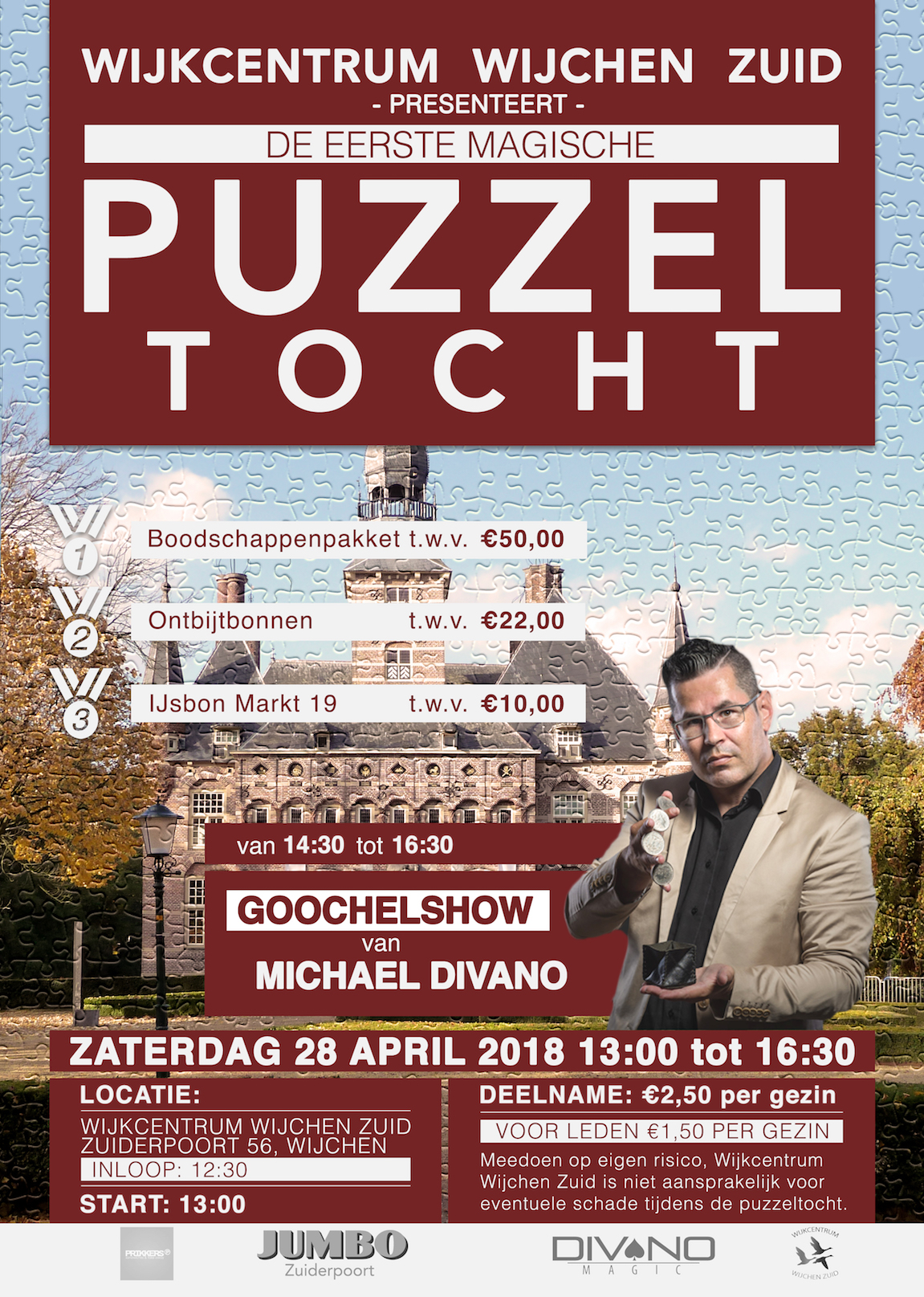 Op 28 april vanaf 13.00 uur is er vanaf Wijkcentrum Wijchen-Zuid (Zuiderpoort 56) een fietspuzzeltocht waarbij leuke prijzen te winnen vallen! Vanaf 14.30 uur volgt dan de goochelshow met Michael Divano. Klik op de afbeelding voor alle informatie.