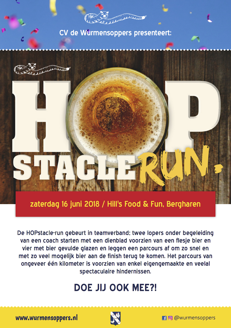 Inschrijven voor teams van 3 personen kan vanaf heden tot 16 juni 15.00 uur via hopstaclerun@wurmensoppers.nl. Om 15.00 uur kan het parcours door de teams verkend worden en daarna start de wedstrijd.