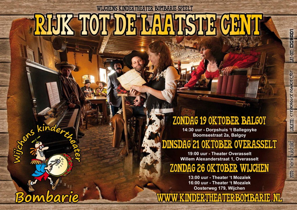 Tijdens de herfstvakantie 2014 speelt het Wijchens Kindertheater Bombarie vier keer het toneelstuk “Rijk tot de laatste cent”.