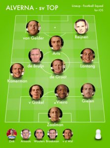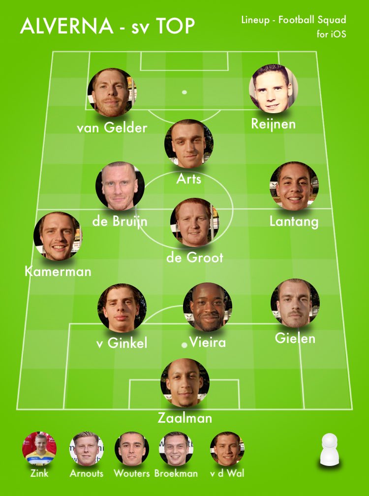 e minuut de 0-1 maakte. Hierna moest Alverna op jacht naar de gelijkmaker, die kwam 10 minuten later toen Sven Reijnen in twee pogingen doelman Vendrig verschalkte (’37 1-1). Voor rust was er nog een kans voor Sven Reijnen, en voor Sven van Gelder die een doorkop bal van Dennis Arts, na een ingooi van Derek de Bruijn niet langs Vendrig kreeg.