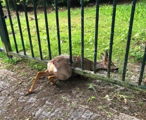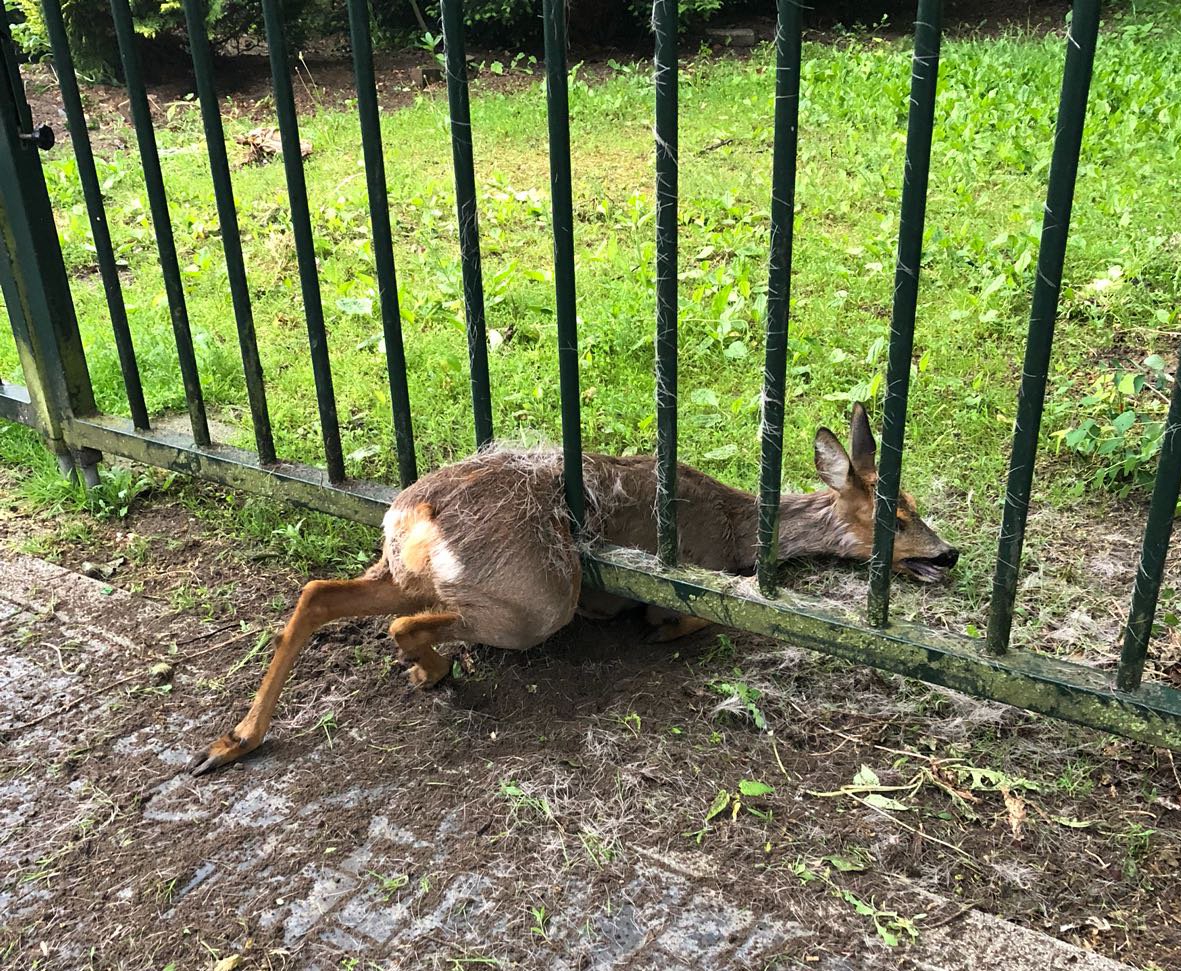 Wijkagent Henry van Galen liet weten via Twitter: "Collega's hebben vanmorgen een ree uit zijn benarde positie bevrijd. Het dier zat vast tussen de spijlen van een hek aan de Sterrebosweg in Wijchen. Het was niet gewond en loopt nu weer in de vrije natuur. Met dank aan de melders!"