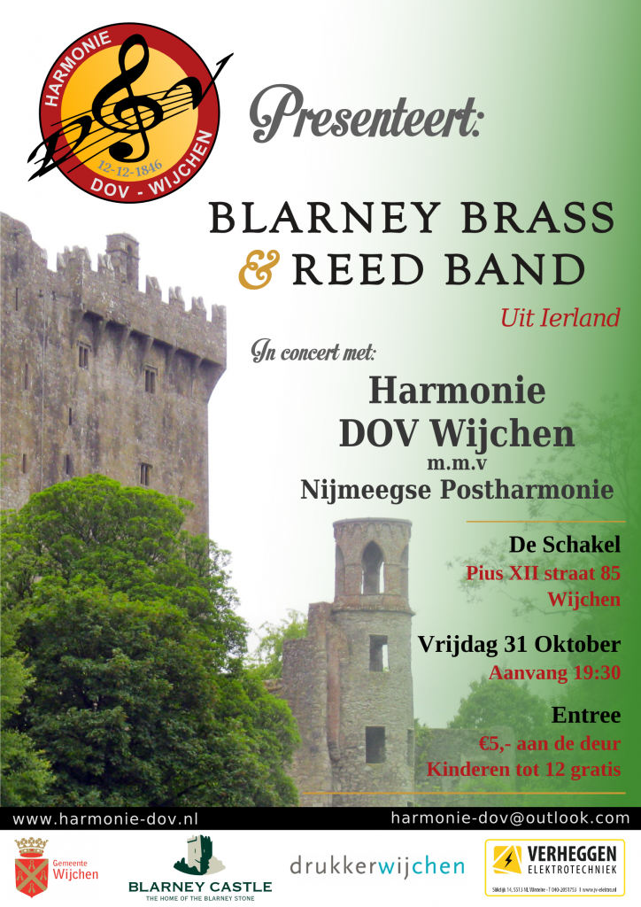 Op vrijdag 31 oktober geeft Harmonie DOV Wijchen samen met de Blarney Brass & Reed Band een concert in De Schakel in Wijchen. De Blarney Brass & Reed Band is een harmonie uit Blarney in het zuiden van Ierland. De BBRB bestaat sinds 1981 en ook al is de bezetting vertrouwd, heeft het toch een Iers karakter. Harmonie DOV is enorm blij dat ze in Wijchen samen met hen een optreden wil geven. Onder de bezielende leiding van Jan van Aart zal Harmonie DOV beginnen, daarna zal de BBRB het na de pauze overnemen. Na afloop van het concert is er gelegenheid om samen met de muzikanten gezellig na te borrelen. Het concert begint om 19:30 uur in De Schakel aan de Pius XII straat 85 te Wijchen.