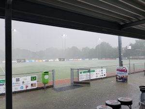Al heel de dag hing de regen in de lucht. Toch was het tot een halfuur voor de wedstrijd droog. Toen begon het echter met tussenpozen hard te regenen. De mannen uit Wijchen en hun Veenendaalse tegenstander moesten er maar mee zie te dealen. Gespeeld zou er worden.