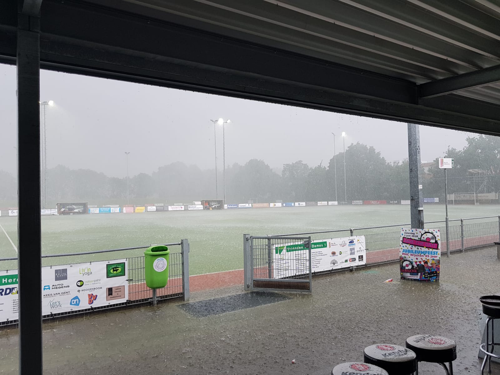 In de tweede helft bleek al gauw dat de regen niet zomaar zou ophouden, ook was er in de verte onweer te horen. Er zou nog slechts 12 minuten doorgespeeld worden. In deze minuten trof Veenendaal twee keer doel door slordigheden van hun tegenstander. Bij een 1-3 achterstand behaalde Wijchen net een strafcorner, toen een grote bliksemschicht in de lucht verscheen. Met kleine plassen achtten zij het veld nog net bespeelbaar, maar dit vonden de scheidsrechters gevaarlijk worden, waarom zij de wedstrijd staakten. Toen het onweer afgelopen was, werd er met een schuin oog naar de scheidsrechters gekeken of er nog gespeeld zou worden. Tegelijkertijd begonnen er naast grote plassen ook grote bulten op het veld te ontstaan. Water wat niet weg kon spoelen, hoopte op onder de toplaag van het veld. Zeer verwonderlijk voor een semi-waterveld wat grote hoeveelheden water zou moeten kunnen verwerken. Dat er niet meer gespeeld zou worden vandaag, was nu wel duidelijk.