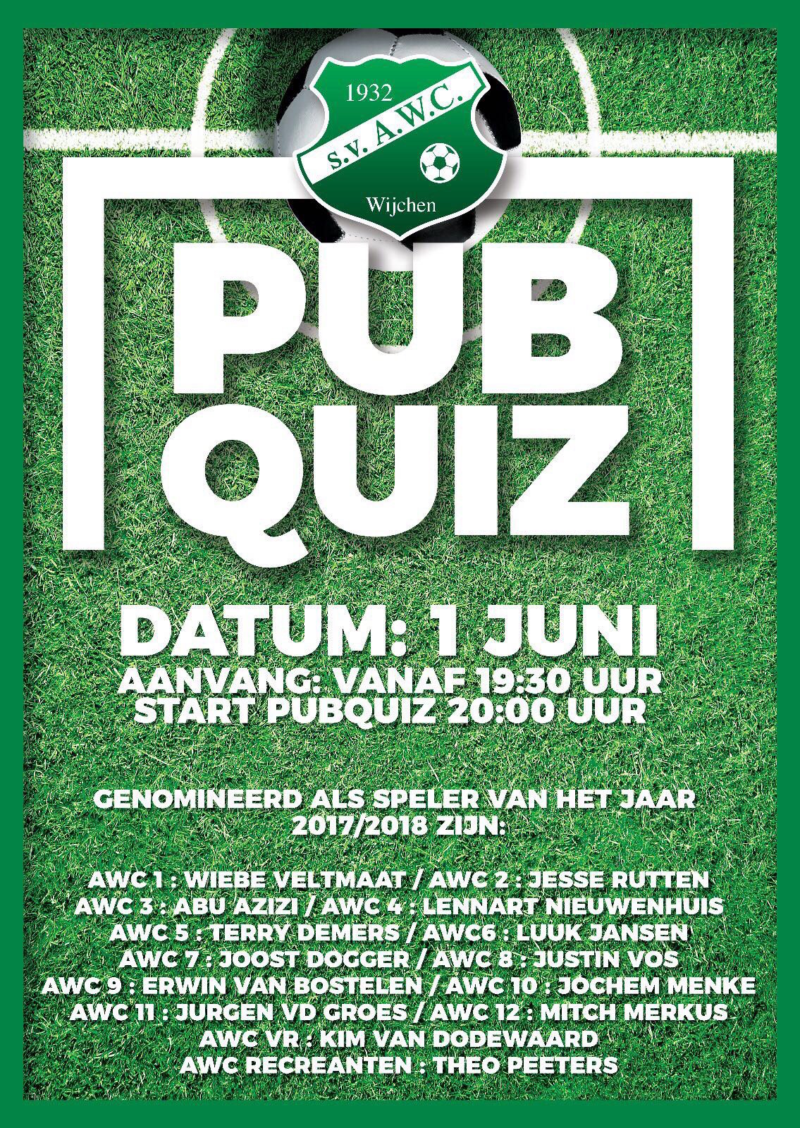 Vrijdag 1 juni is er een Pubquiz bij AWC. Tevens wordt de speler van het seizoen 2017/2018 gekozen. Aanvang van de avond is 19.30 uur, de quiz start om 20.00 uur, iedereen is welkom!
