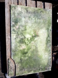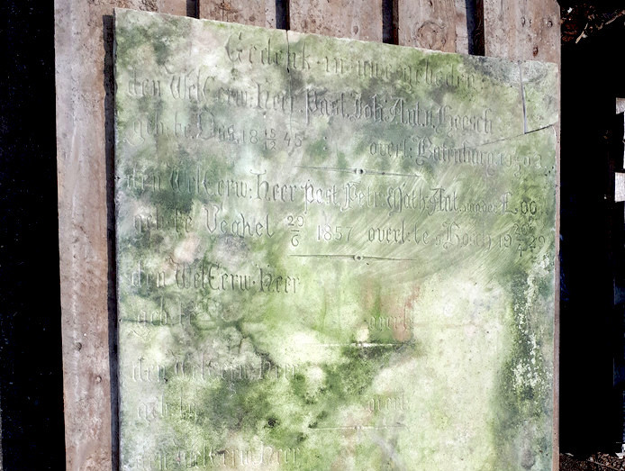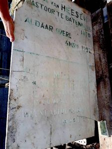 De opknap van het 145 jaar oude grafheuveltje de Calvarieberg op de begraafplaats van Batenburg heeft een verrassing opgeleverd. Bij het weghalen van de gedenkplaat voor het priestergraf (foto links) kwam aan de binnenzijde een tweede plaat (foto rechts) - hoogstwaarschijnlijk de originele - tevoorschijn.