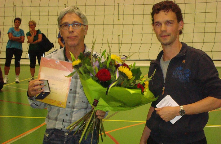 Namens de Nevobo mocht Buijs een bronzen speld aan Cuppen uitreiken, die daarmee erg verheugd was.