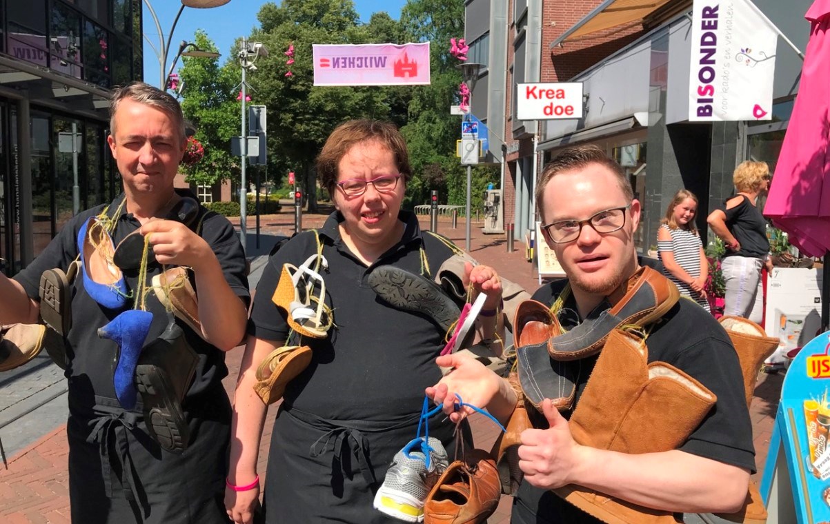 Nou, bij het leuke kado-en verhalen winkeltje Bisonder in de Touwslagersbaan zijn er al heel veel schoenen ingeleverd! De medewerkers Patricia, Kevin en Edwin zijn dan ook erg trots en hebben de veters van de schoenen al aan elkaar gestrikt! En dan moeten er natuurlijk leuke actiefoto’s gemaakt worden.
