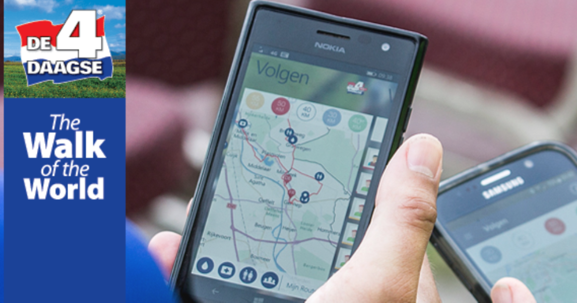 De app heet 'Vierdaagse 2018' en is te herkennen aan het officiële Vierdaagse-logo. Deze app geeft informatie over uw locatie op de route, de gemiddelde wandelsnelheid, het laatste nieuws en het weer. Ook is het mogelijk om andere deelnemers te volgen.