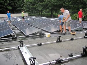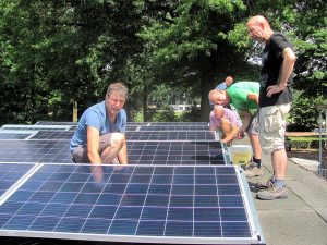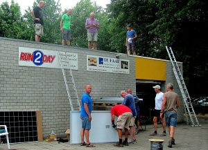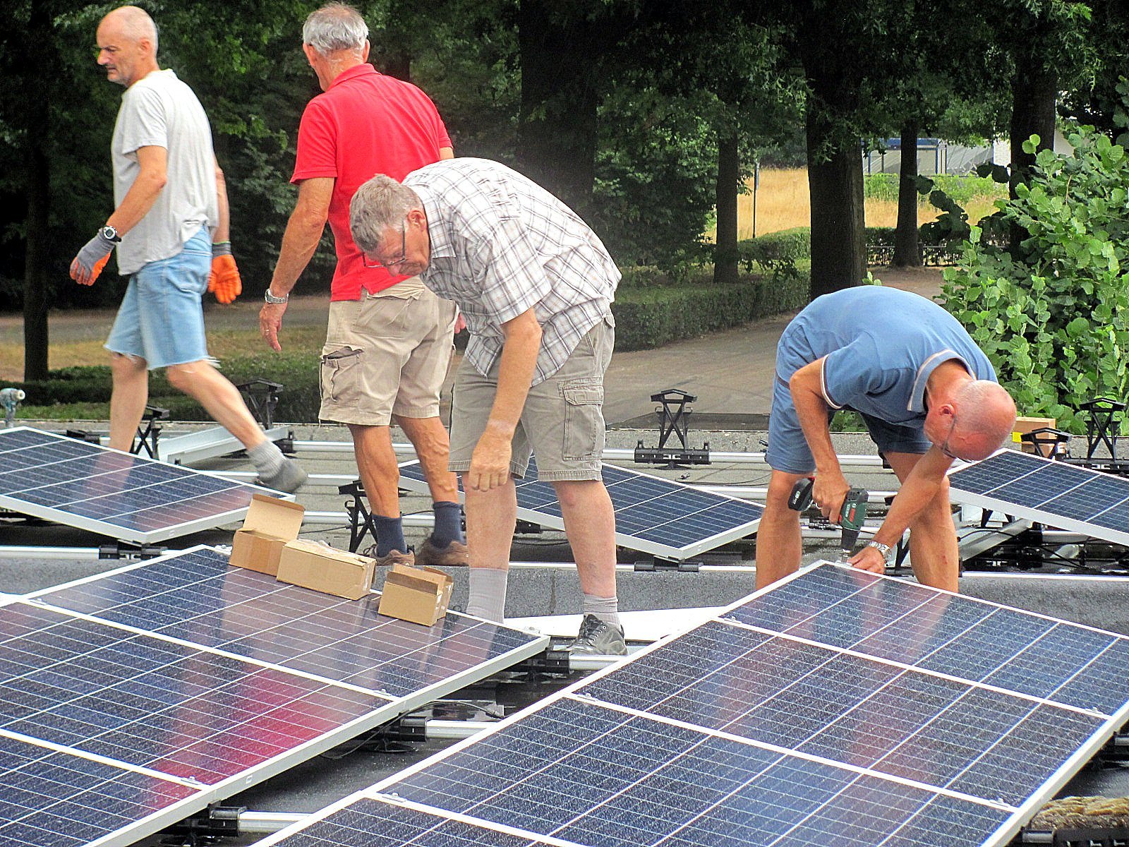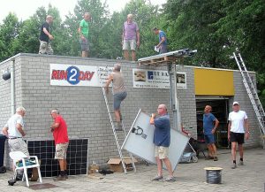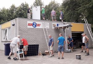 Afgelopen zaterdag hebben 14 vrijwilligers van Atletiek Vereniging Wijchen, 80 zonnepanelen op het dak gelegd en gemonteerd op het clubhuis van AVW. Ze waren erg gemotiveerd want de leden van AVWijchen stoppen graag hun energie in de sportvereniging. In verband met de verwachte warmte ging men al om 7.00 uur voortvarend van start. In de week vooraf waren al veel voorbereidingen getroffen door de technische leden van de werkgroep. Zo is alle verlichting in het clubhuis vervangen door led verlichting, bedrading aangelegd en de omvormer geplaatst.